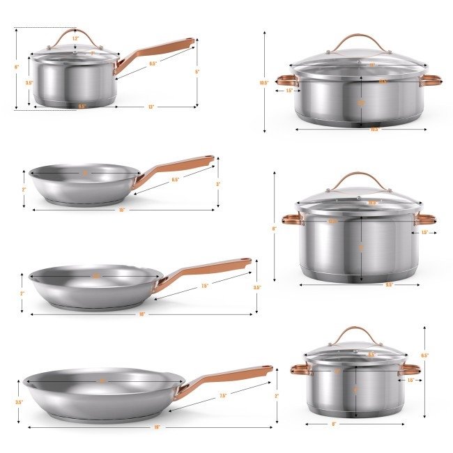 This 11 Piece Stainless Steel Kitchen Cookware Set Gold Handles perform all cooking tasks, large or small–simmer, sauté, fry, boil or braise. It includes a 1.7 QT saucepan with lid, a 3.3 QT stockpot with lid, a 5.7 QT stockpot with lid, a 4.5 QT stockpot with lid, an 8-inch skillet, a 9.5-inch skillet, and an 11-inch skillet. This set of cookware features a 3-ply base for fast and even heat induction and is adaptable to most of the cooking surface, gas, electric, induction or ceramic tops.