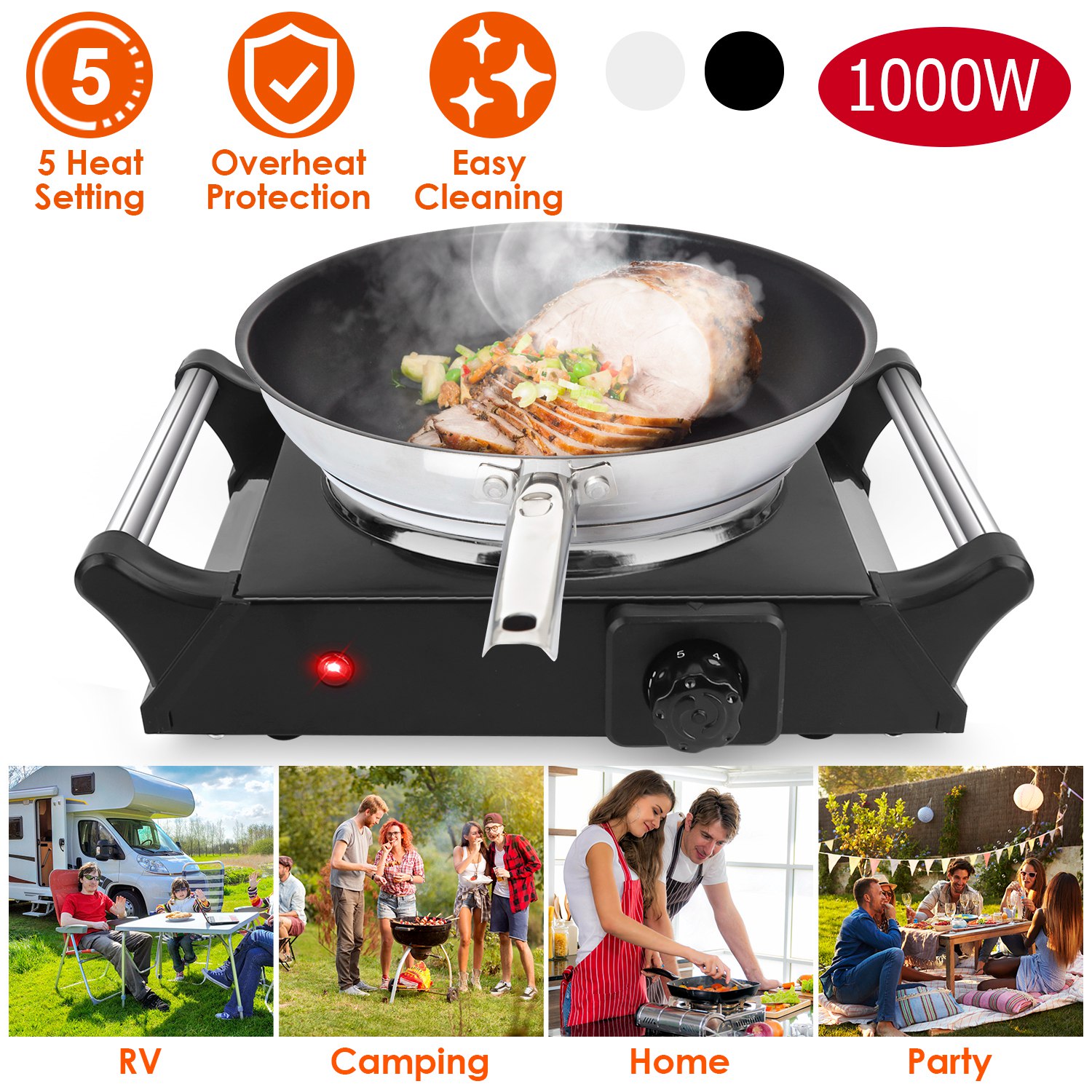 Home > 1000W Electric Single Burner Portable Coil Heating Hot Plate Stove Countertop RV Hotplate with 5 Temperature Adjustments Portable Handles