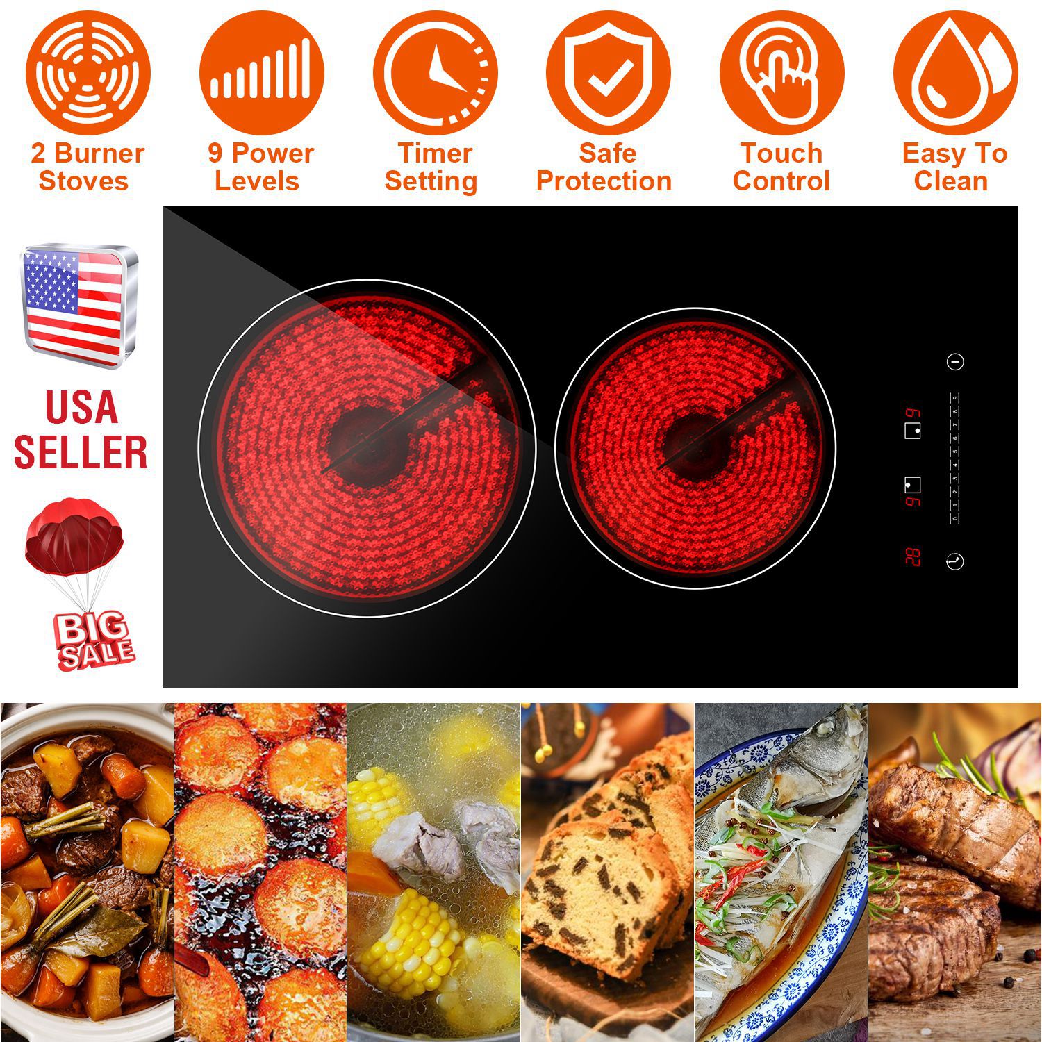 No flickering and dangerous fire. Our dual burners electric cooktop has total power of 1900W, supports simultaneously cooking and heats up food quickly and evenly. With 9 levels of power, each burner can be individually controlled by touch panel and satisfy your various cooking method, like simmer, fry, boil, bake and so on. Smart timer setting from 1-99minutes, the electric stove will automatically shut down, no need to stay by the side all the time. High-hardness, heat-resistance and strong load-bearing capacity provide you long service time. Compatible with almost all kinds of cookware, like wok, glass cookware, stainless steel pot, aluminum pot, etc.. An ideal and reliable kitchen helper.