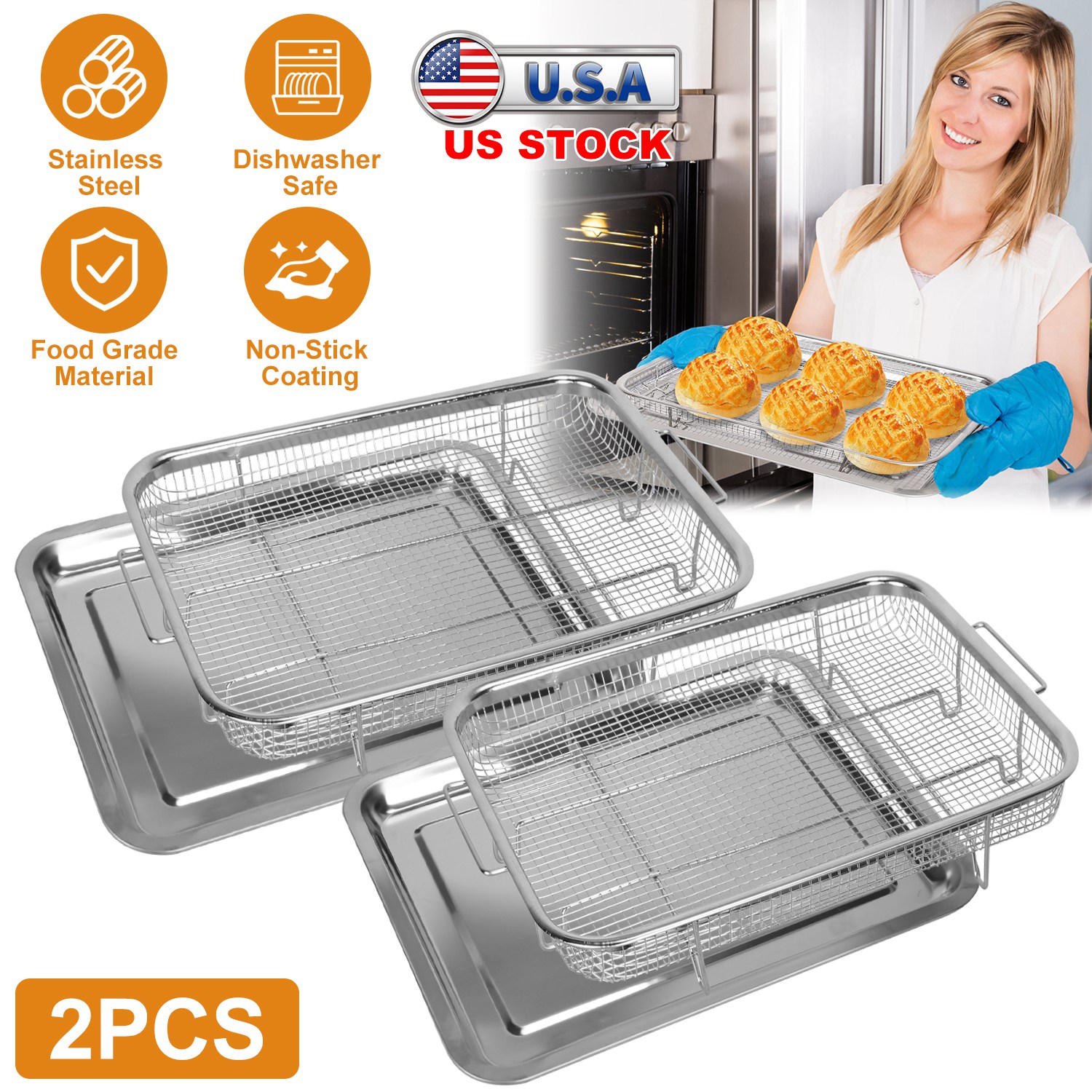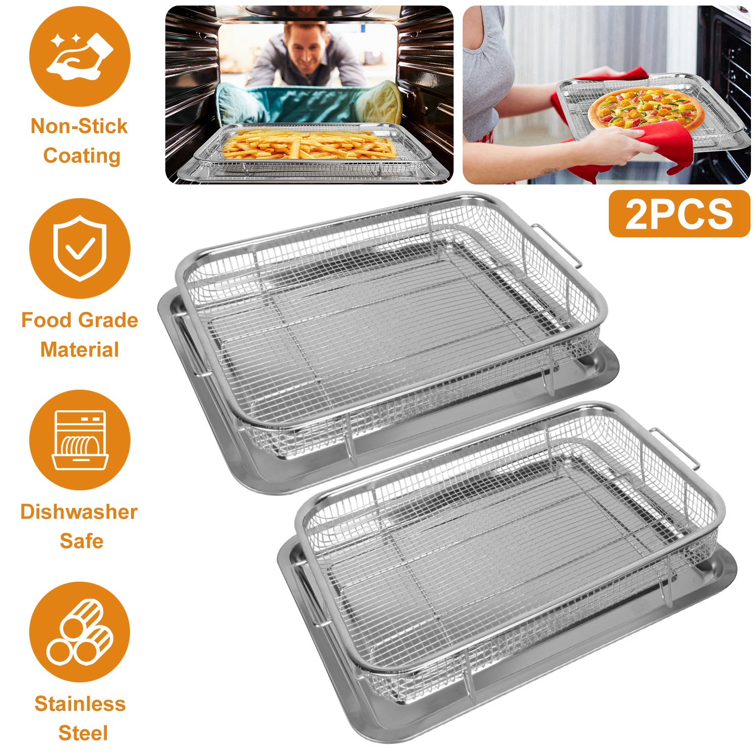 Home > 2Pcs Air Fryer Basket Tray 15.35x11.61in Stainless Steel Rustproof Non-Stick Oven Pan and Tray For Bake Grill Crispy Food Dishwasher Safe