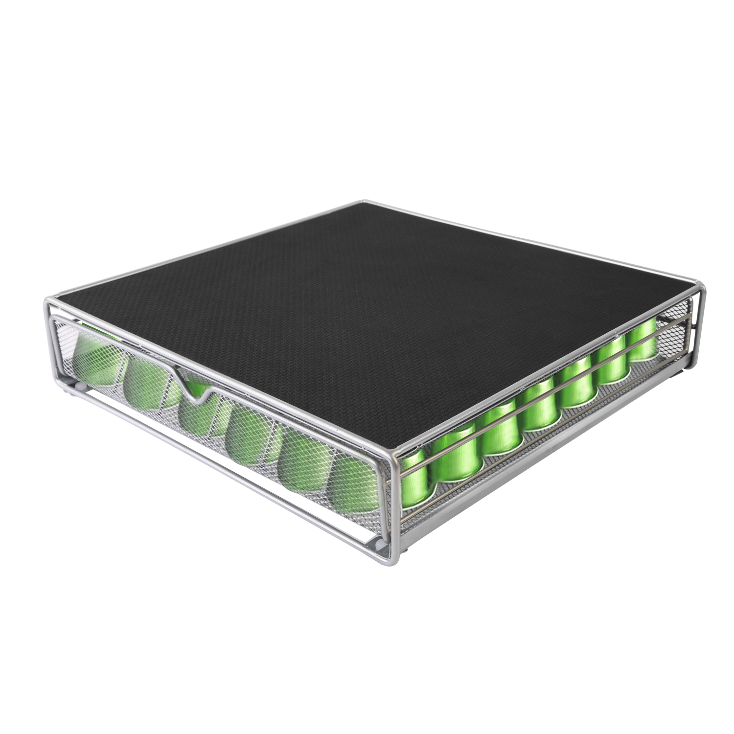 This coffee machine stand is made of metal mesh welded/soldered over a metal frame, sturdy enough to hold your Keurig machine. The drawer has 6 rows with room to spare for capsules organizer, and each row holds 6 K-cups. Refillable cups can fit into the rows, too. If you spill water onto the top of this stand by accidentally while refilling the Keurig, you don’t have to scramble to wipe it up right away, because the water will puddle there without seeping through. Brilliant convenience to your neat lifestyle.