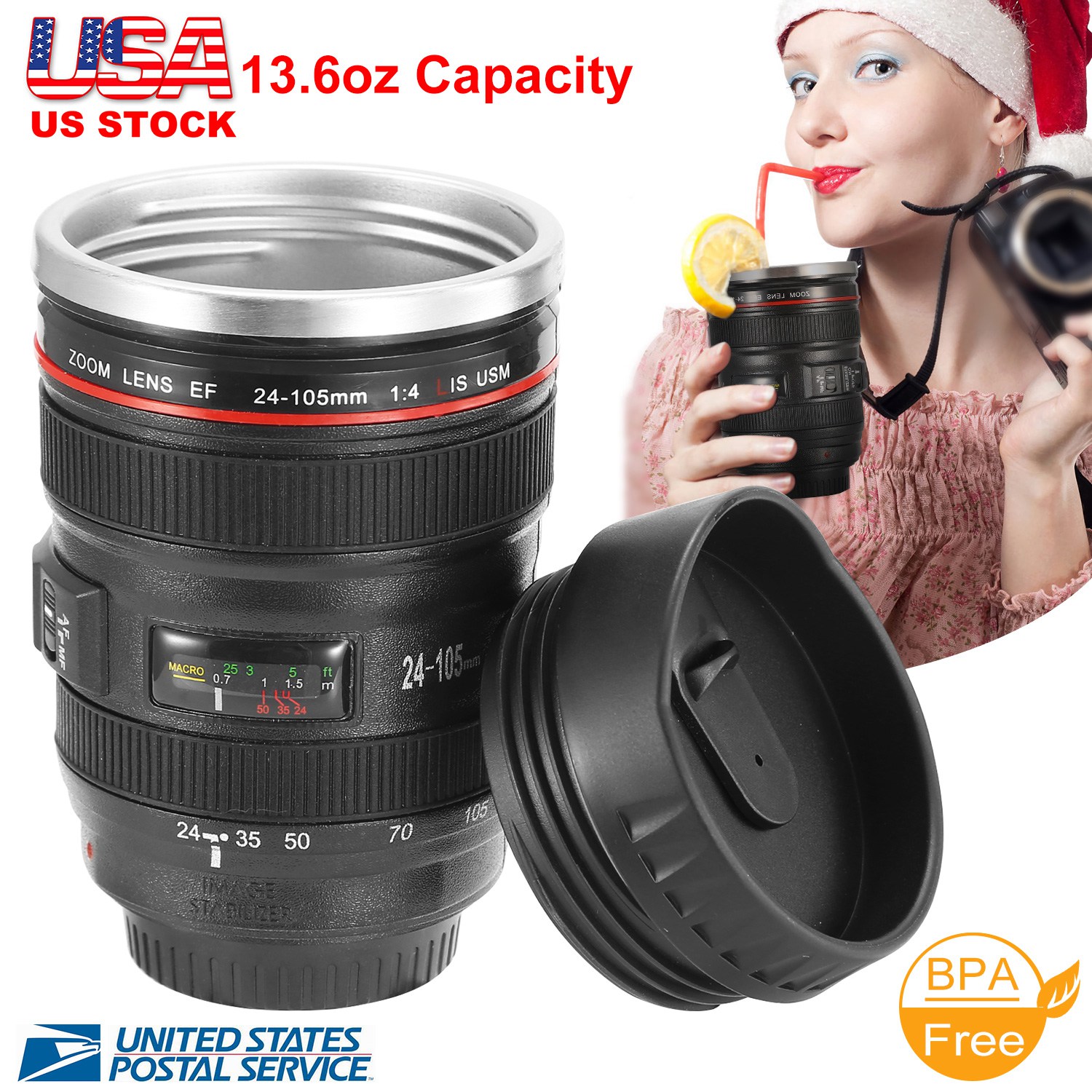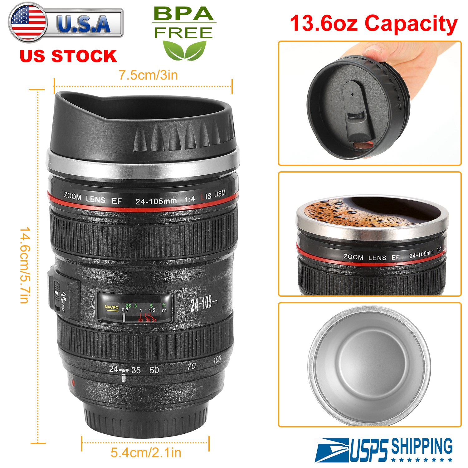 Our camera lens mug is a simulation to Camera Lens Model EF 24-105mm f/4.0L USM Lens with clear and anti-fading camera lens shape, which makes it a must-have collectible and amazing gift for die-hard photography fans and camera gurus. Made of food-grade ABS plastic materials and high-quality stainless steel inside, which is BPA-free and safe to use for drinking. With up to 400ml/13.6oz capacity and insulation function, coffee mug is great for outdoor activities instead of using disposable poisonous cups. Moreover, it’s also practical to use as a cup, ashtray, money box and pen holder!