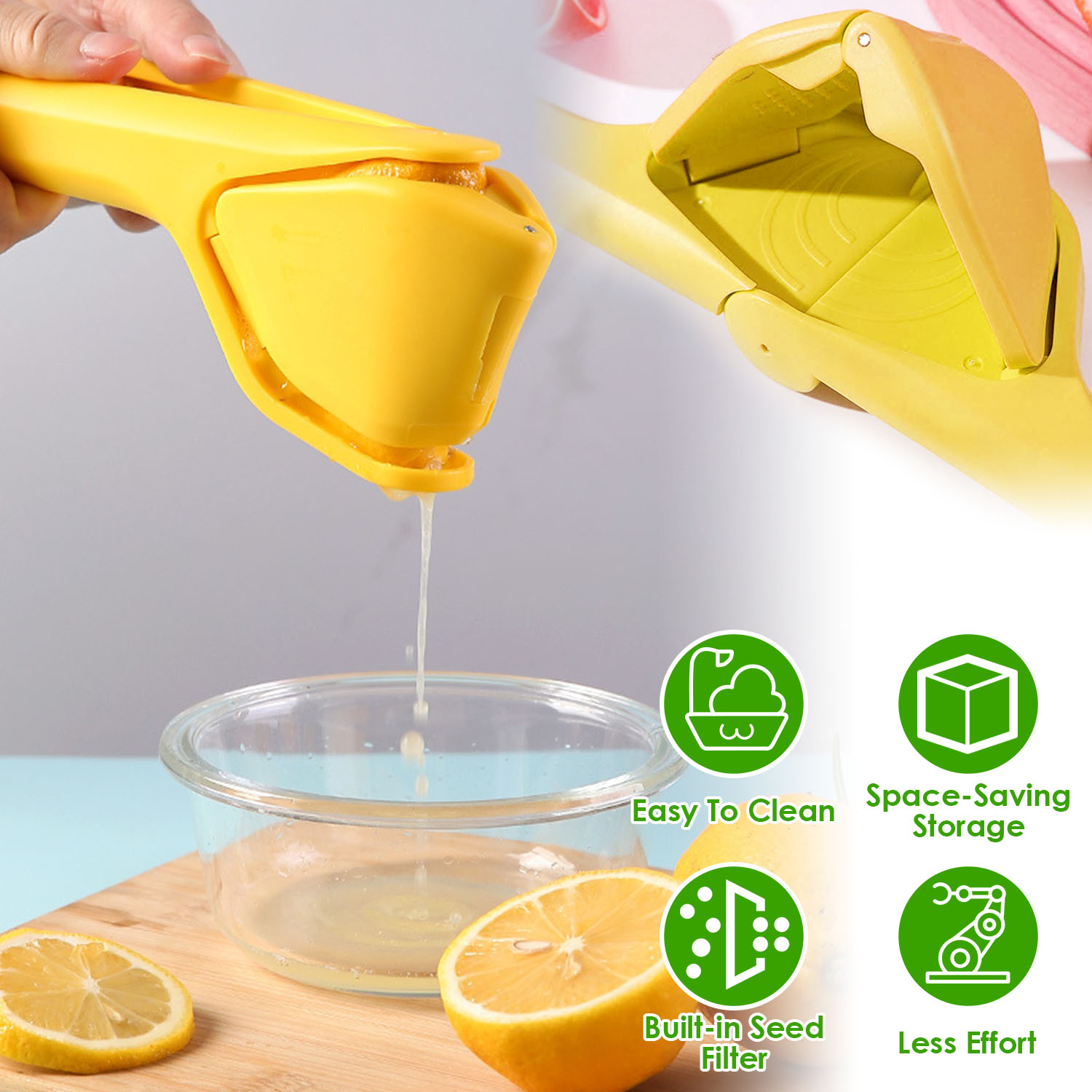 Featured with unique 2-handed sideways pivot operation, our lemon squeezer allows you to easily extract every drop of juice without wasting while reducing effort and fatigue. Built-in diversion port with filter prevents spills while directing the extracted juice into cups or bowls, and anti-slip particles securely hold the lemon in place. Additionally, compact and foldable design makes it perfect for any cabinet drawer or container, maintaining countertop tidiness and organization. Safe to use for extracting juice from various fruits such as lemons, limes, citrus, oranges, pomegranates, etc.. Make a cup of mouthwatering cocktails, soda water or fruit drinks with our manual lemon squeezer!