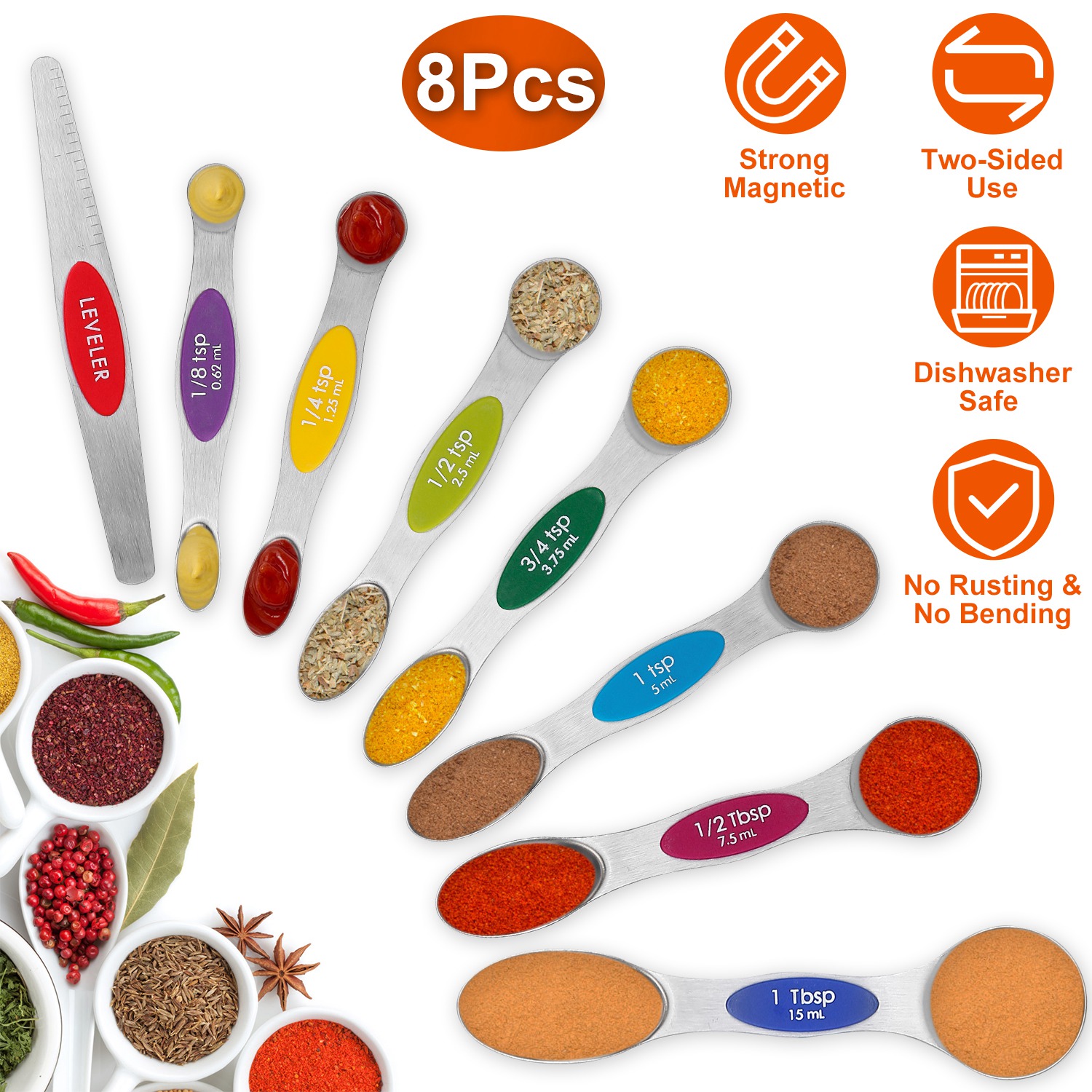 Our spoons set including 8 pieces, is suitable for your baking and kitchen needs to measure coffee, protein powder, spices, baking powder and more. Clear measuring labels are printed on each handle for convenient measurement. Double sided design makes it compatible for both dry and liquid ingredients, round side for liquid ingredient and the narrow oval side for most spice jars. Adopt magnet on the handle, they will be nested together for easy storage. A must-have in the kitchen!