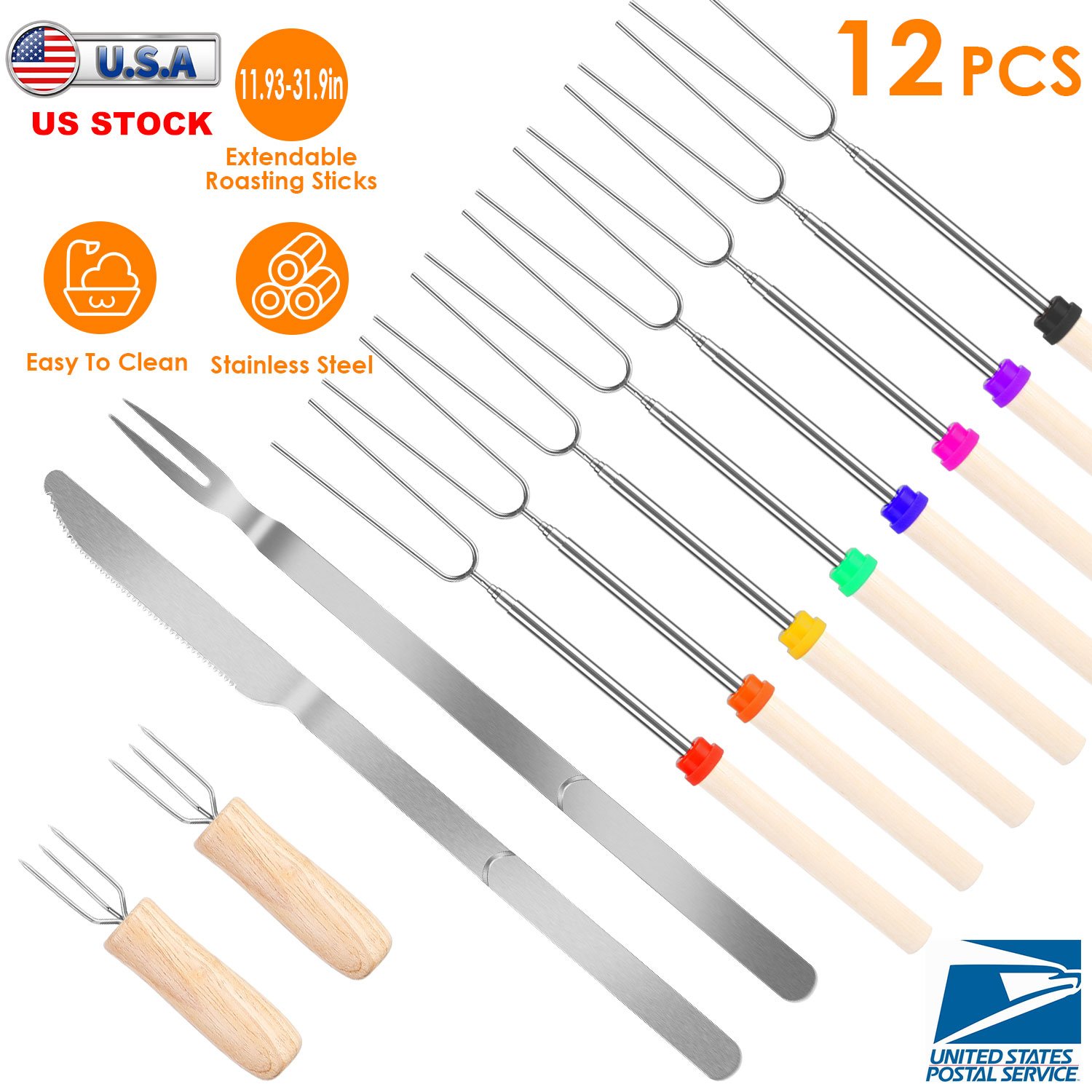 Home > Stainless Steel Roasting Sticks Set 31.9in Extendable Telescoping Marshmallow Hot Dog Fork Skewers Set w/ Corn Needles Fork Knife For BBQ Fire Pit Cam